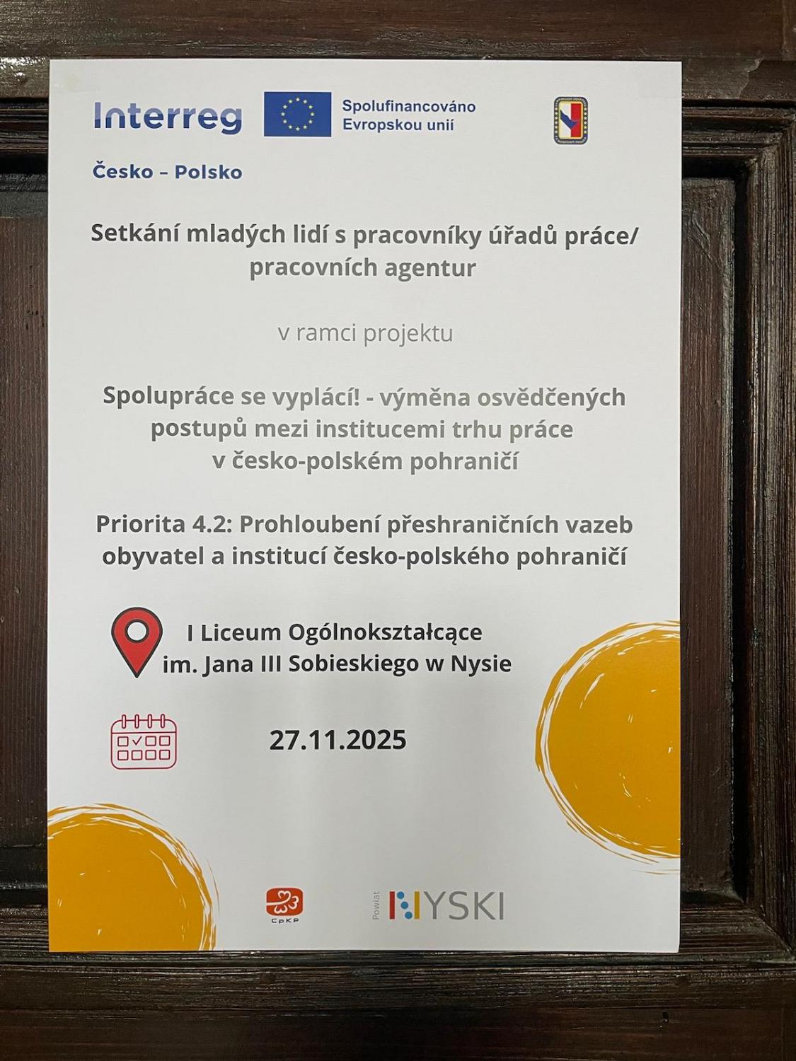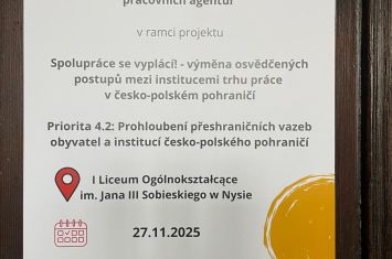 Setkání studentů Česko – Polsko setkání mladých lidí s Úřadem práce. V rámci projektu jsme navštívili Všeobecné lyceum Carolina v Nyse. Projektu se účastnili žáci ze třídy NS4 - Stavaři s třídní učitelkou Mgr. Ivanou Přikrylovou a p. asistentkou Ing. Monikou Alkovou. Na závěr akce jsme měli prohlídku města. Akce se vydařila a děkuji touto cestou za dobré vystupování žáků.