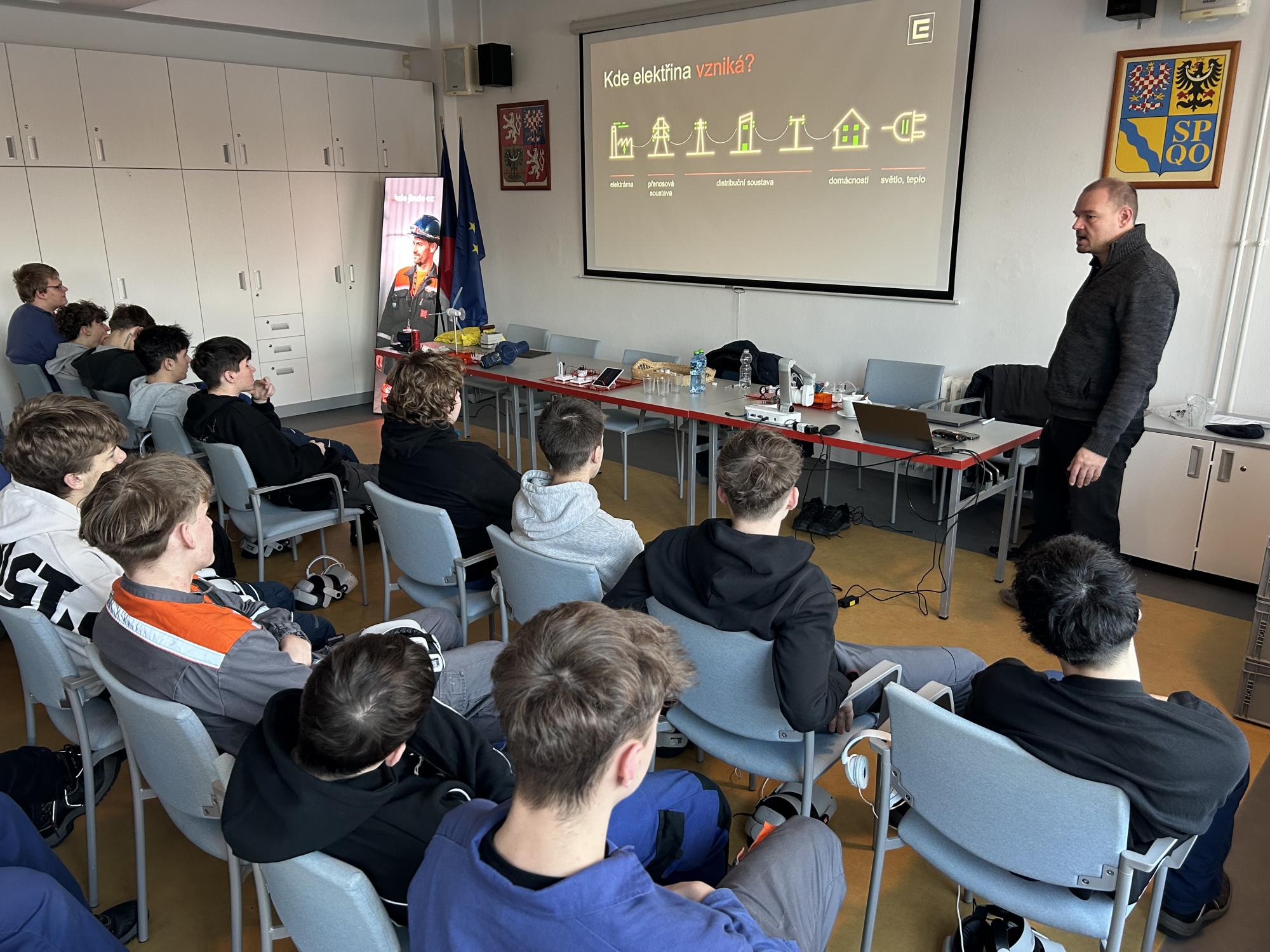 Dnešního workshopu Setkání s energií se zúčastnili žáci našich elektro oborů. Lektoři připravili úžasnou prezentaci, která byla plná zajímavých a praktických informací. Demonstrace na reálných fyzických příkladech podpořila zvědavost studentů a pomohla s vizualizací daných jevů. Nadšení vyvolala i virtuální realita-prohlídka jaderného reaktoru a řídicího střediska.
