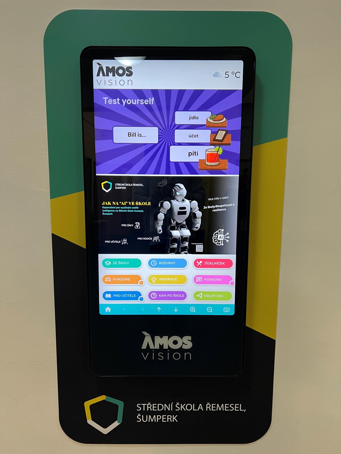 S radostí oznamujeme, že jsme v rámci neustálé modernizace a digitalizace naší školy nainstalovali do vestibulu u recepce nový informační dotykový panel ÁMOS Vision.
