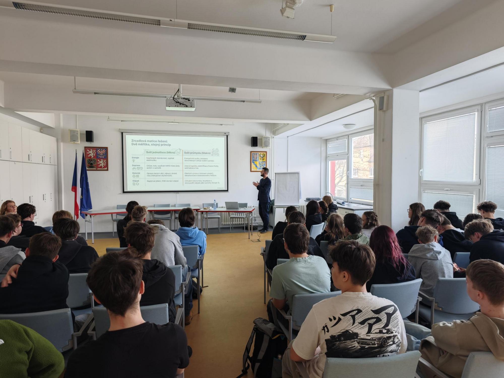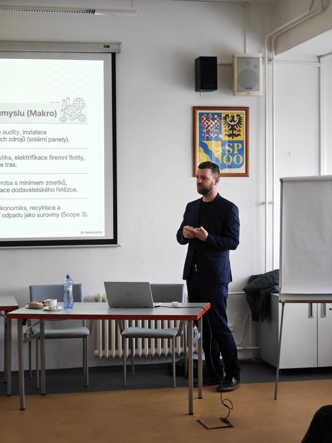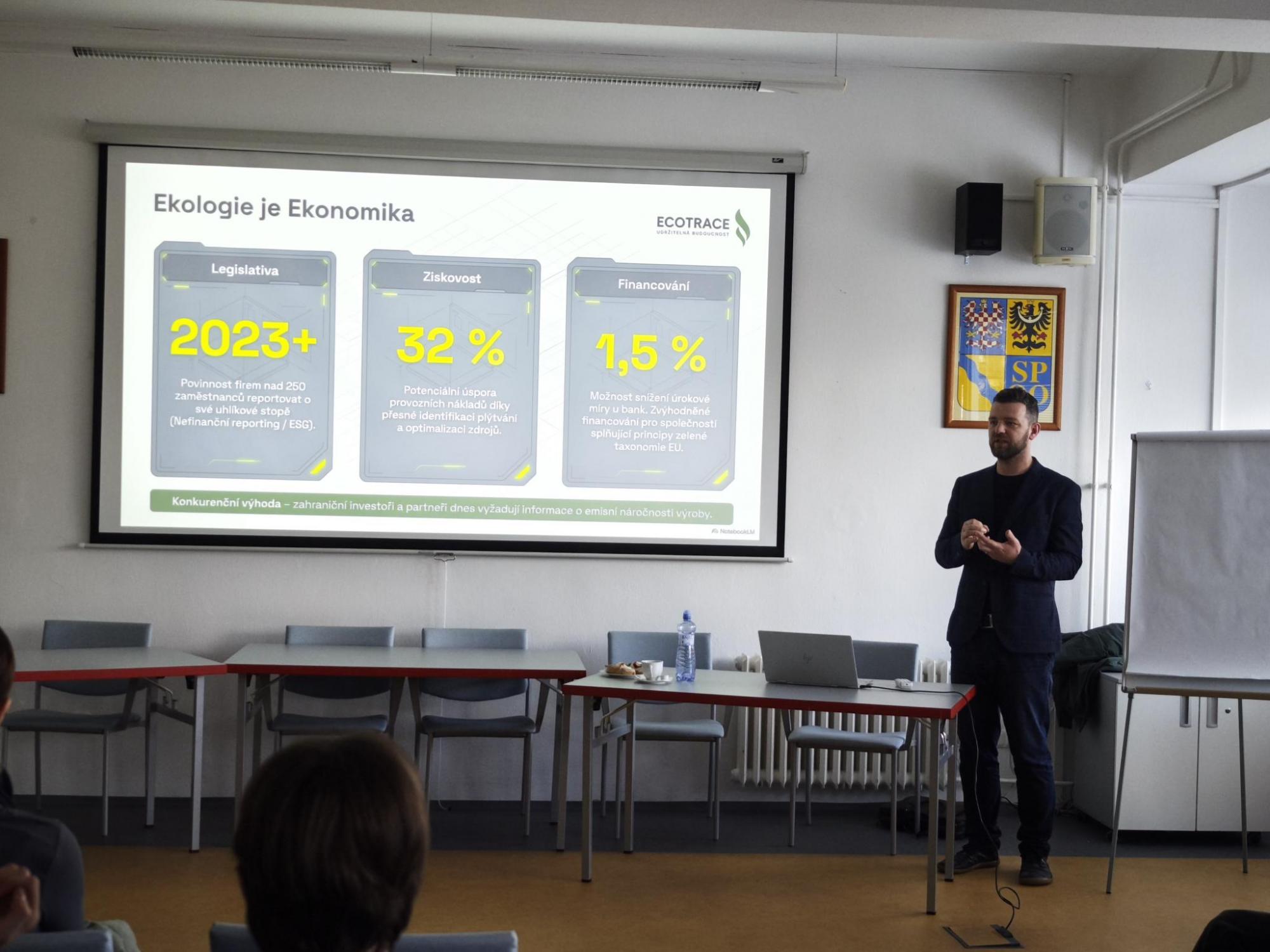 Z firmy ECOTRACE k nám přišel Ing. Adam Roller, aby stavařům, strojařům a nábytkářům z prvních a druhých ročníků v rámci Environmentální výuky vysvětlil pojem uhlíková stopa a ukázal možnosti jejího snížení jak pro jednotlivce, tak pro průmyslové společnosti.